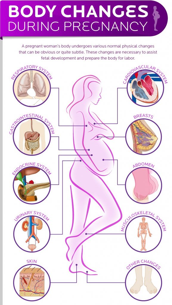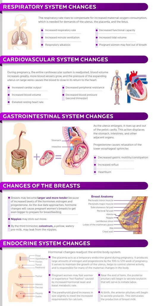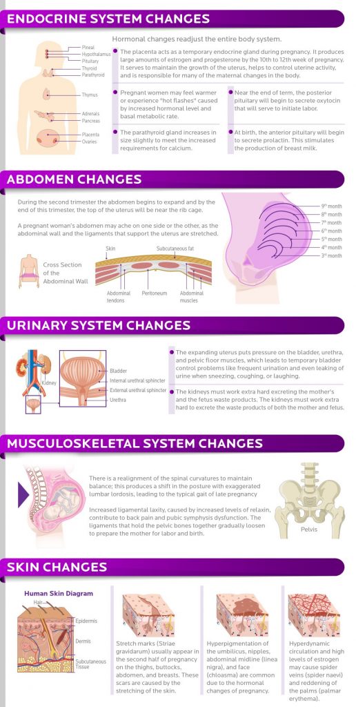 Hormonal changes, which begin in the first trimester, will lead to many physiological changes throughout the body. These changes help prepare the mother’s body for pregnancy, childbirth, and breastfeeding.